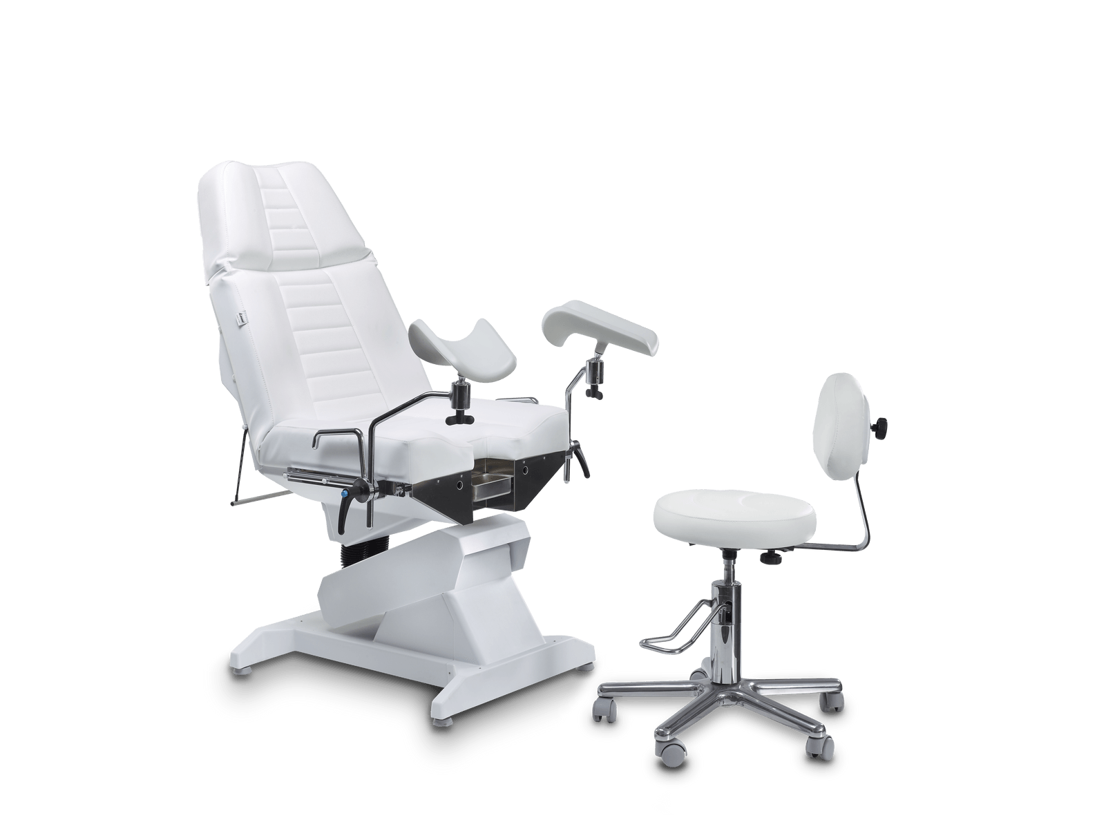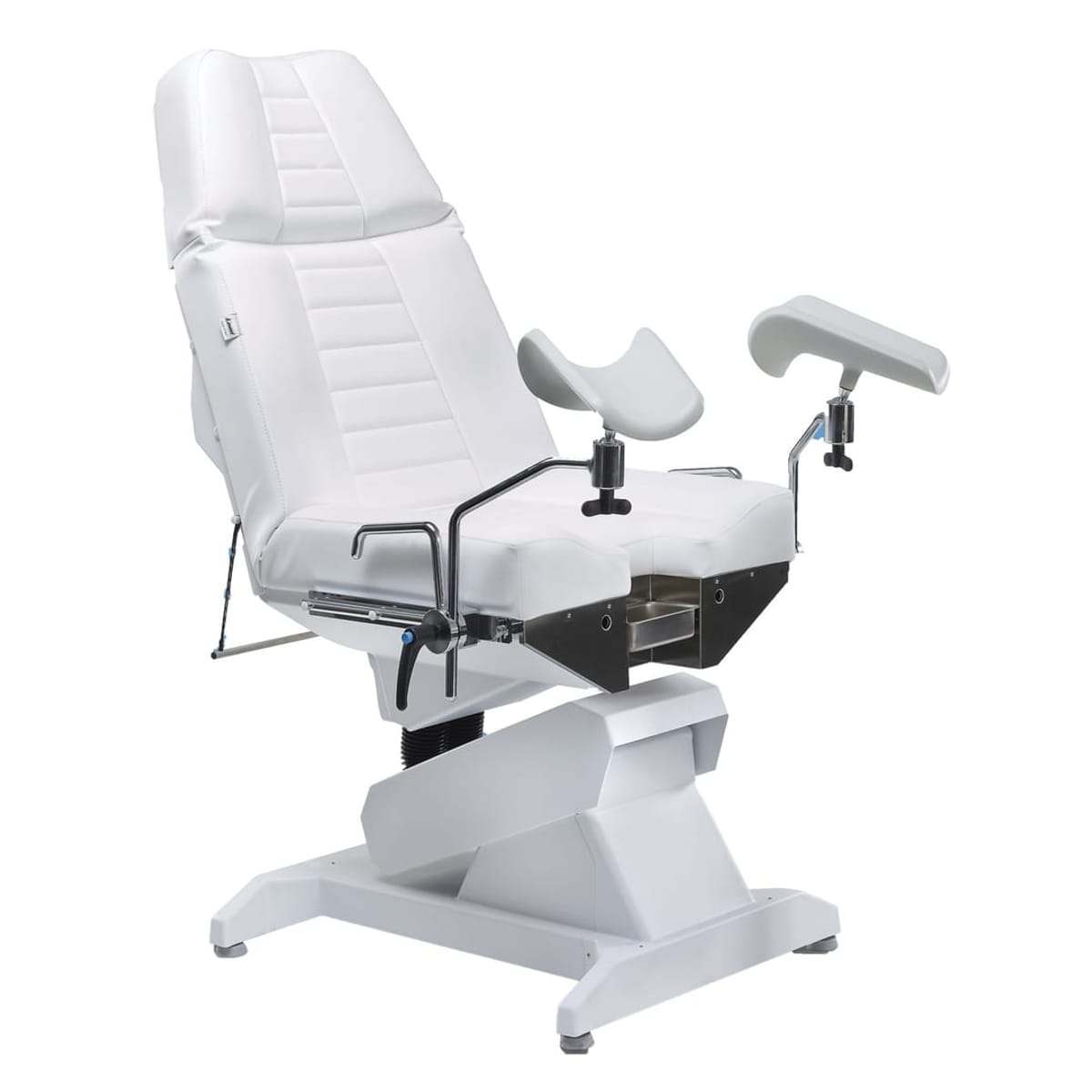 Стандартна комплектация на гинекологичния стол: Опори за колене тип Гьопел, малко легенче, крачен ел. педал за контрол на фукциите, държач за хартия.
