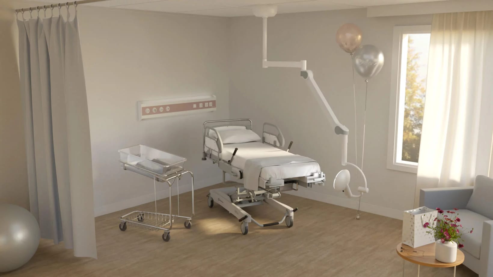 Лампа Q-flow 2CM на финландската компания Merivaara е специално проектирана за родилни зали - така че да стига максимално ниско. Висок клас хирургична лампа с интензитет 100 000 lux.